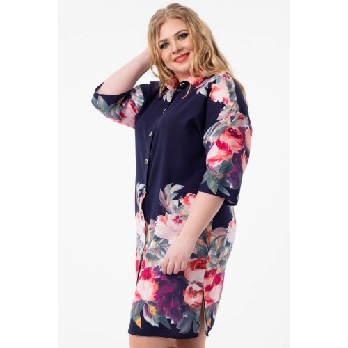 Великолепная рубашка прямого силуэта из текстильного полотна синего цвета. Круглый вырез изделия обработан отложным воротничком. Рубашка с втачными рукавами. По переду изделия планка с застежкой на пуговицы.