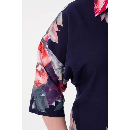 Великолепная рубашка прямого силуэта из текстильного полотна синего цвета. Круглый вырез изделия обр..