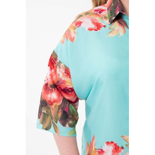 Великолепная рубашка прямого силуэта из текстильного полотна мятного цвета. Круглый вырез изделия об..
