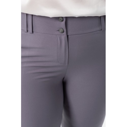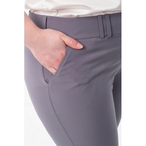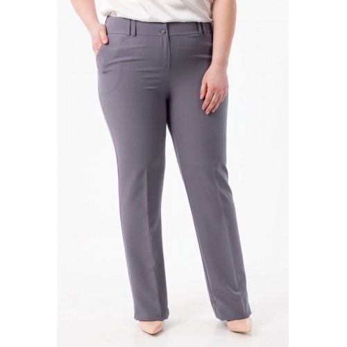 Классические прямые брюки из плотного текстильного полотна серого цвета. Брюки со шлевками, застежкой на переднюю молнию и пуговицы.