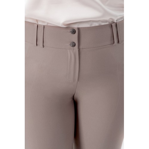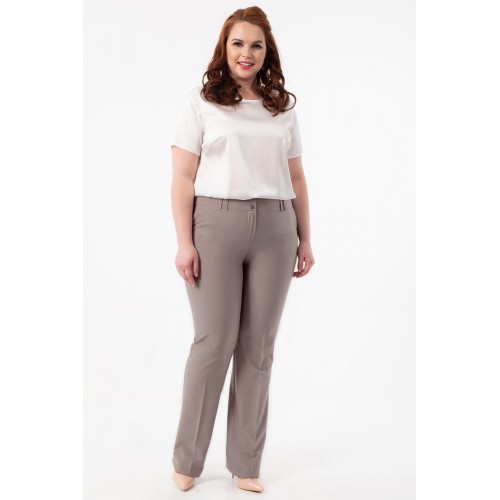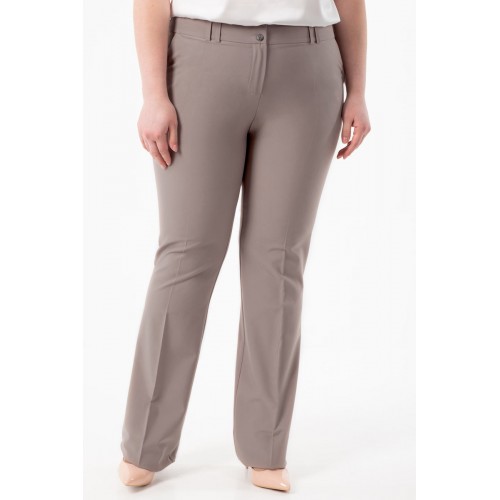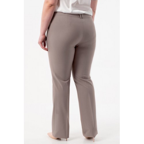 Классические прямые брюки из плотного текстильного полотна коричневого цвета. Брюки со шлевками, застежкой на переднюю молнию и пуговицы.