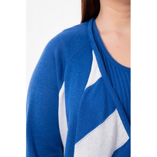 Яркий кардиган полуприлегающего силуэта сине-белого цвета. Кардиган выполнен в технике «ручного вязания» из хлопковых нитей. Изделие со спущенной проймой и втачными рукавами.