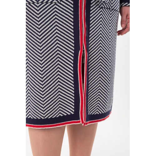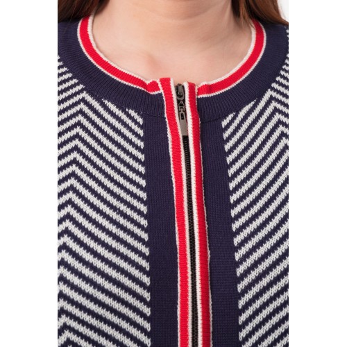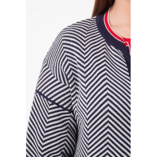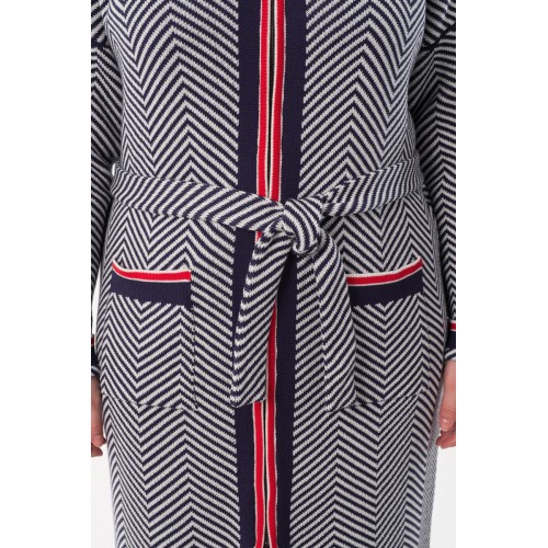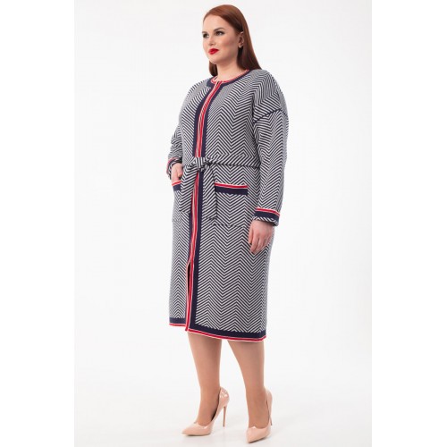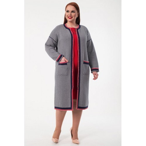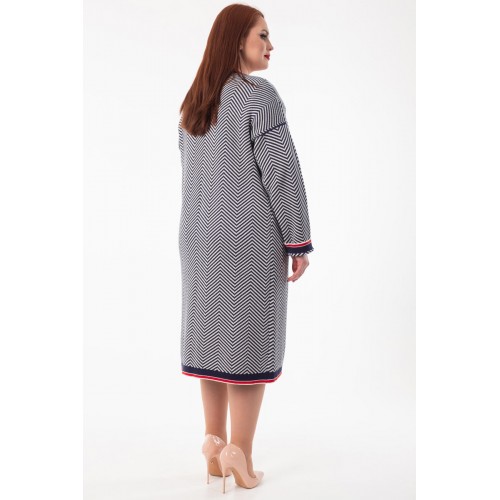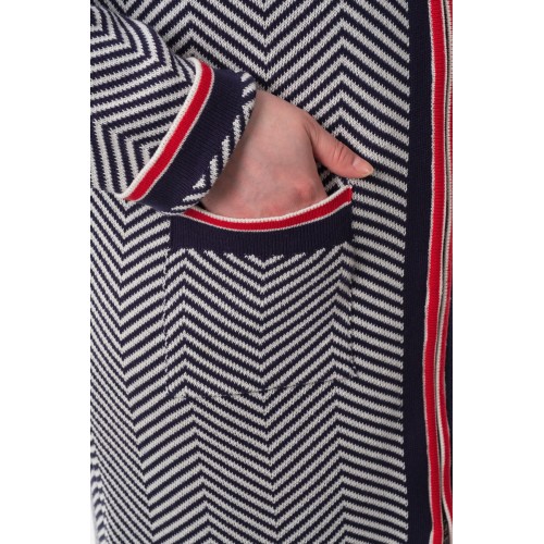Яркий кардиган полуприлегающего силуэта сине-белого цвета. Кардиган выполнен в технике «ручного вяза..