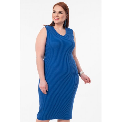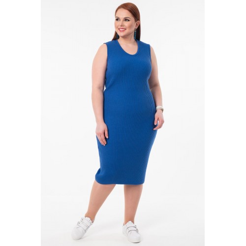 Стильное платье прилегающего силуэта синего цвета. Платье выполнено в технике «ручного вязания» из натуральных нитей с содержанием хлопка. Круглый вырез изделия и проймы обработаны двухсторонней лицевой бейкой.