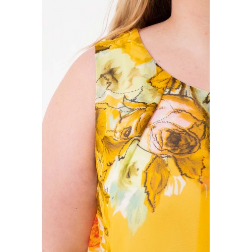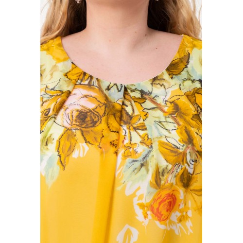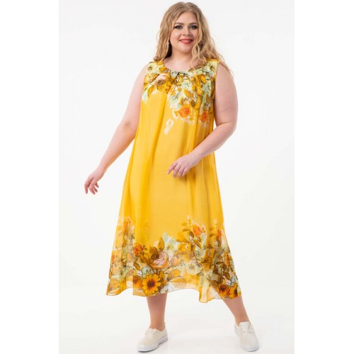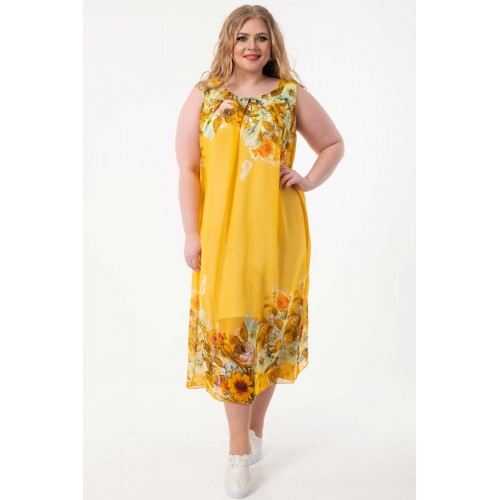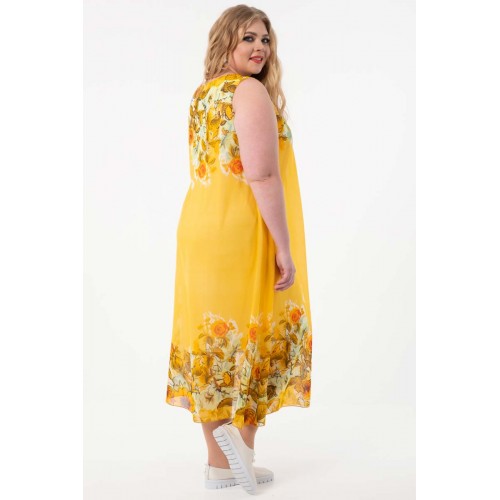 Роскошное платье полуприлегающего силуэта из текстильного полотна «шифон» желтого цвета с купонным рисунком. Изделие на трикотажном подкладе. Рост фотомодели — 170 см. Производство Россия.