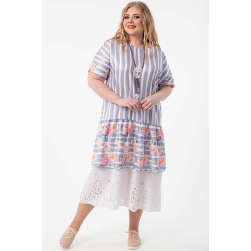Обаятельное платье полуприлегающего силуэта из текстильного полотна с купонным рисунком сиренево-белого цвета цвета. Круглый вырез обработан внутренней обтачкой. Платье с цельнокроеными рукавами. Перед изделия дополнен широкой оборкой и кружевом. Рост фотомодели — 170 см. Производство Россия.