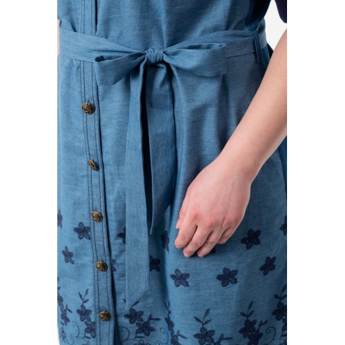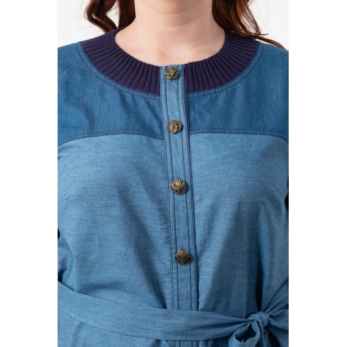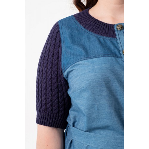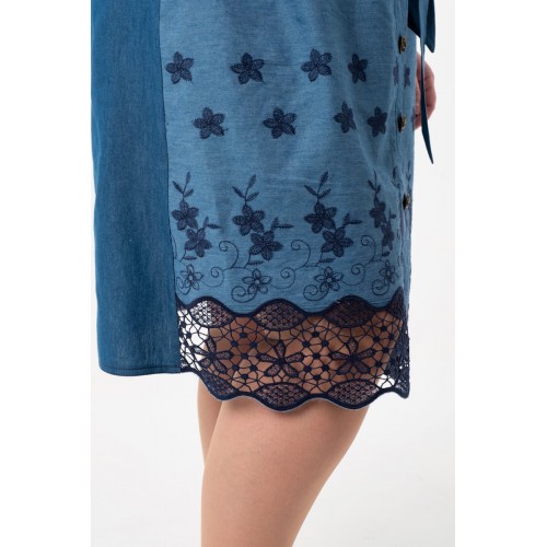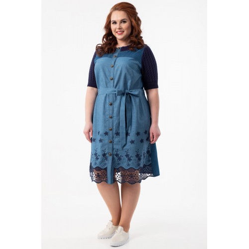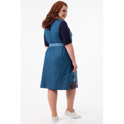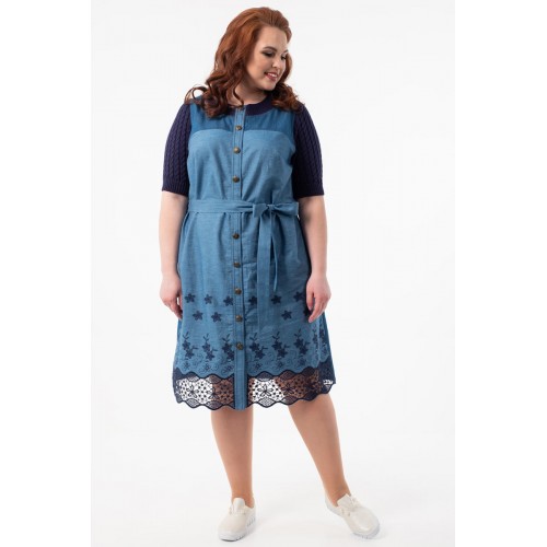 Стильное платье полуприлегающего силуэта из текстильного джинсового полотна темно-синего цвета. Круглый вырез изделия и втачные рукава выполнены в технике ручного вязания из хлопковых нитей синего цвета. Застежка на пуговицы по планке переда. По низу платья декоративная кружевная вышивка. Перед изделия дополнен отсрочками.