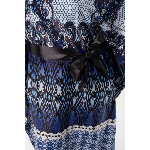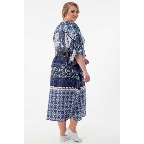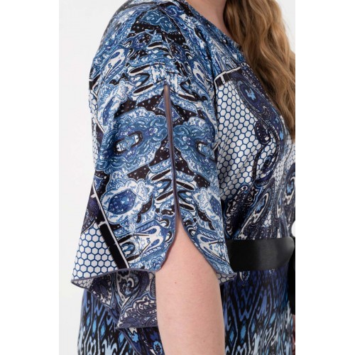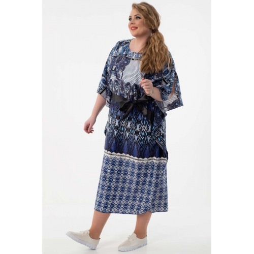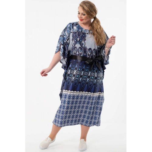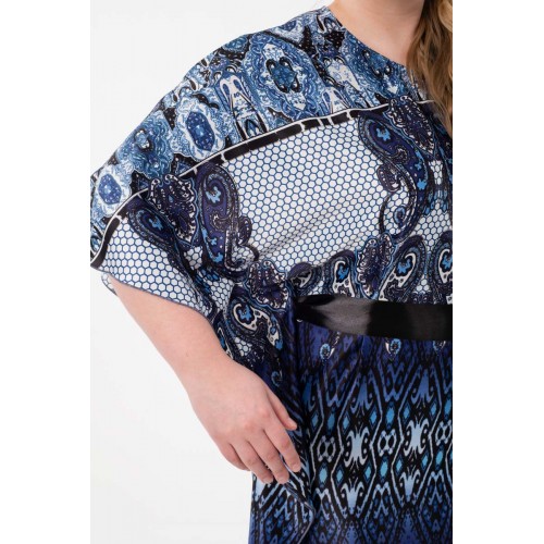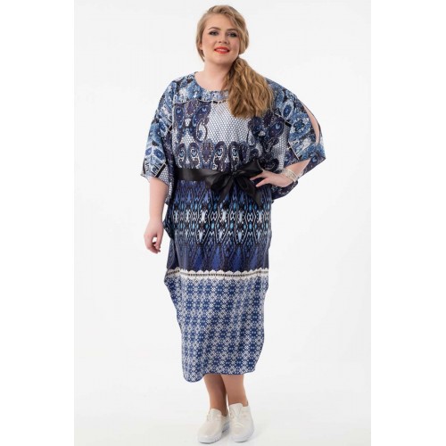 Эффектное платье свободного силуэта из текстильного полотна с купонным рисунком сине-серого цвета. Круглый вырез горловины обработан внутренней атласной бейкой. Платье с цельнокроеными рукавами. В комплект входит атласный пояс черного цвета.