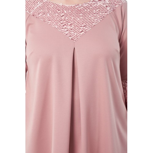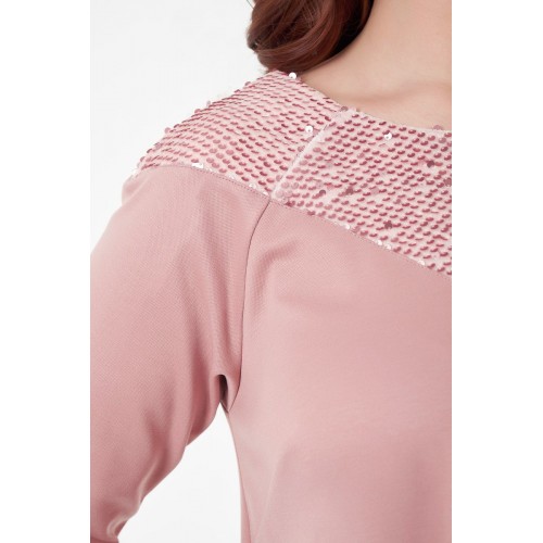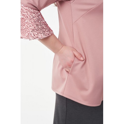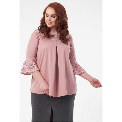 Обаятельная туника А-силуэта из трикотажного полотна светло-розового цвета. Круглый вырез изделия обработан внутренней обтачкой. Туника с рукавами реглан. Кокетка переда и воланы по низу рукавов выполнены из декоративного бархатного полотна с пайетками. По переду изделия выполнена декоративная складка. Длина изделия по спинке от плечевого шва до низа изделия - 74 см. Рост фотомодели — 170 см.